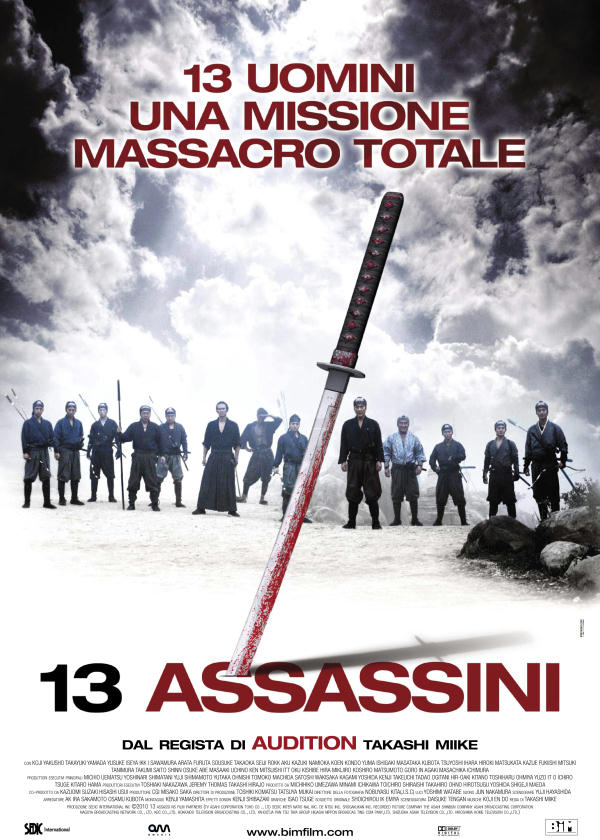 La storia narra di un gruppo di dodici samurai (più un tredicesimo che si aggiungerà in seguito), che dovrà combattere contro un esercito intero per eliminare un signorotto feudale (Naritsugo) feroce e sanguinario. Il tutto per evitare che l’uomo possa consolidare ancora di più il proprio potere, approfittando dell’impunità di cui gode (etteparèva) e della schiera di soldati pronti a morire per difenderlo. Dopo una prima parte più contemplativa (anche se il sangue arriva dopo pochi minuti, mostrando il suicidio rituale di un uomo), si passa all’azione vera e propria: la dinamica di fatto è quella di un puro action-movie, solo con qualche spiegazione etico-filosofica in più rispetto alla media. I riferimenti di fondo, da tenere presente, sono almeno due: “I sette samurai” di Kurosawa – altro bellissimo film – e l’omonimo <<13 Assassini>> di Eiichi Kudo, del 1963.