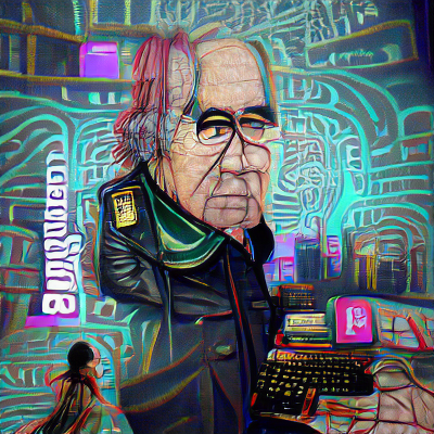 Foto di copertina: Baudrillard di fronte ad un simulacro simile ad uno smartphone, in versione cyberpunk (generato da StarryAI)